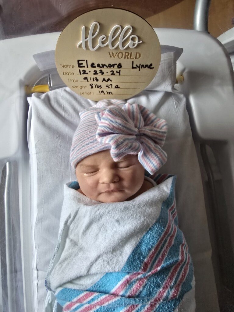 Eleanore Lynne Hendzell was born on 12/23/24, weighing 8 lbs. 4.7 oz. and measuring 19 inches.